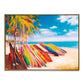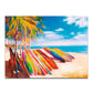 A surfboard on a beach in summer